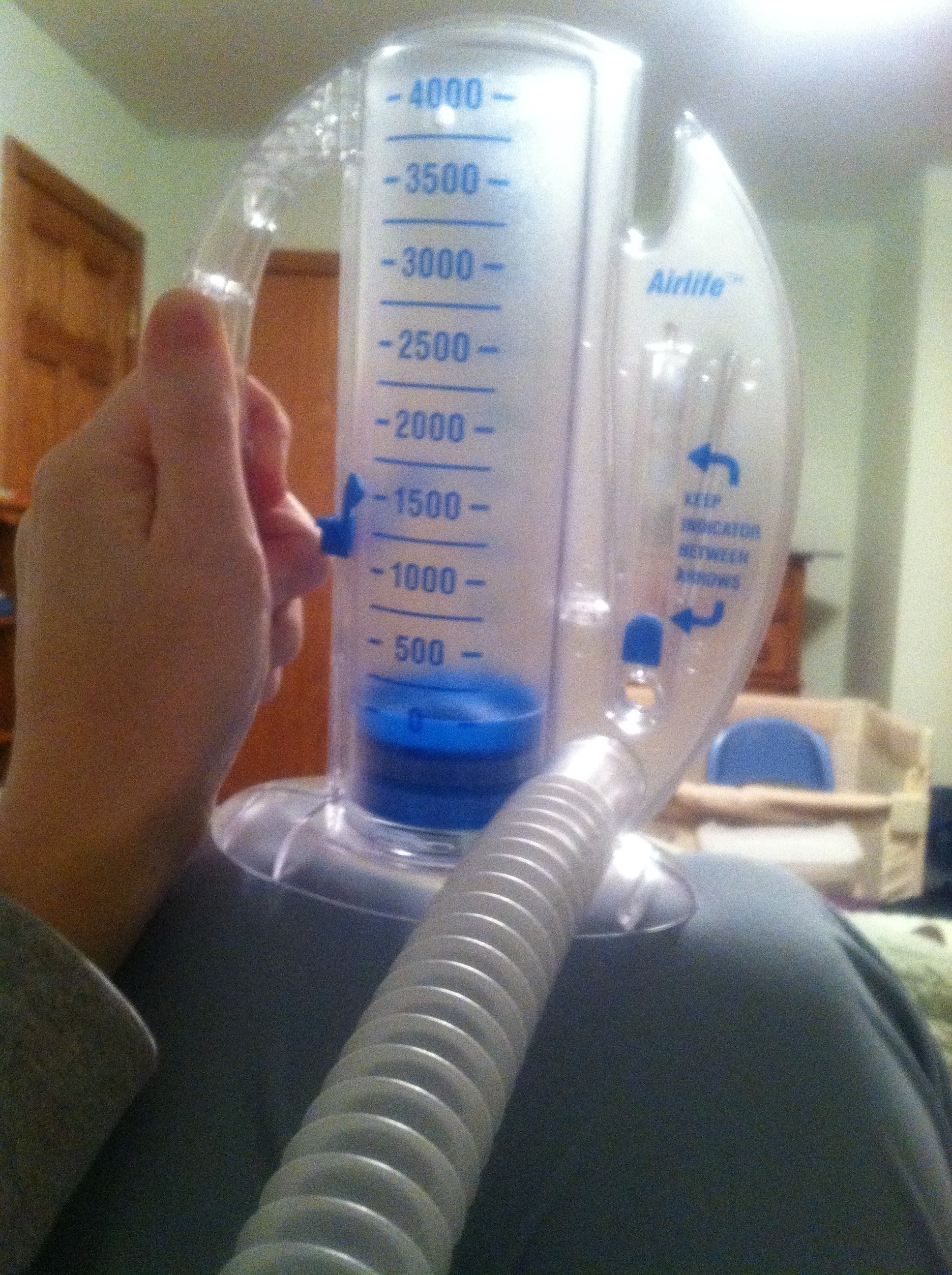 After my surgery, I was given the task of using a spirometer to measure my lung capacity. First, I would exhale, then with the tube in my mouth, I would inhale the deepest breath I could manage. The goal was to get the ball to 4,000 to show that my lung capacity was back to normal. For several weeks, I couldn't take a deep breath. How strange it was to not be able to do this! I realized I had taken something so "simple" as breathing for granted. I remember the day I finally succeeded and took a full, deep breath. Victory!  Since that painful but refining experience, I've had a lot of time to reflect on how much of a gift it is to breathe deeply, and what the source of my oxygen really is.